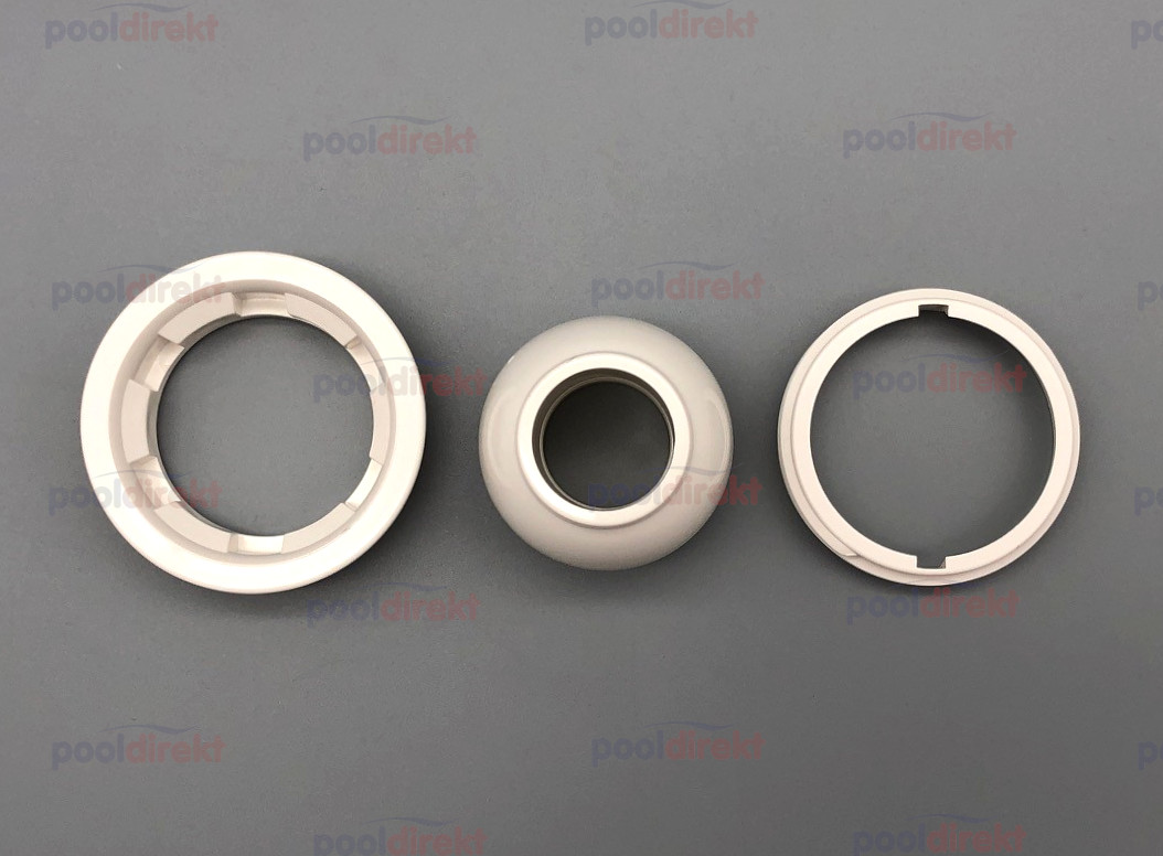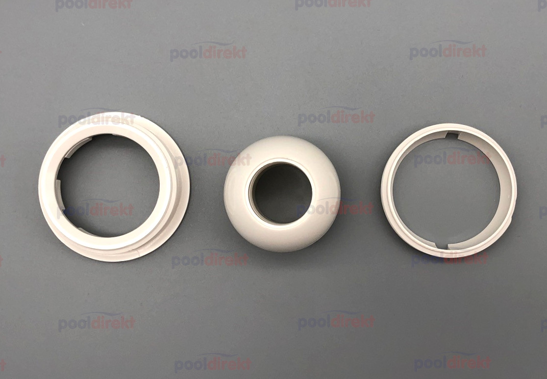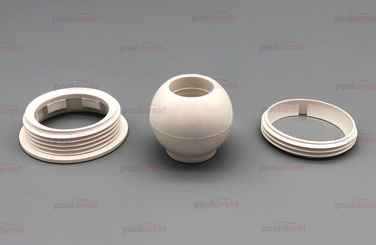 Ersatzteil-Paket zur Astral Einlaufdüse bestehend aus Düsenkugel, Kugelhalterung-Innenteil, sowie Außenteil.