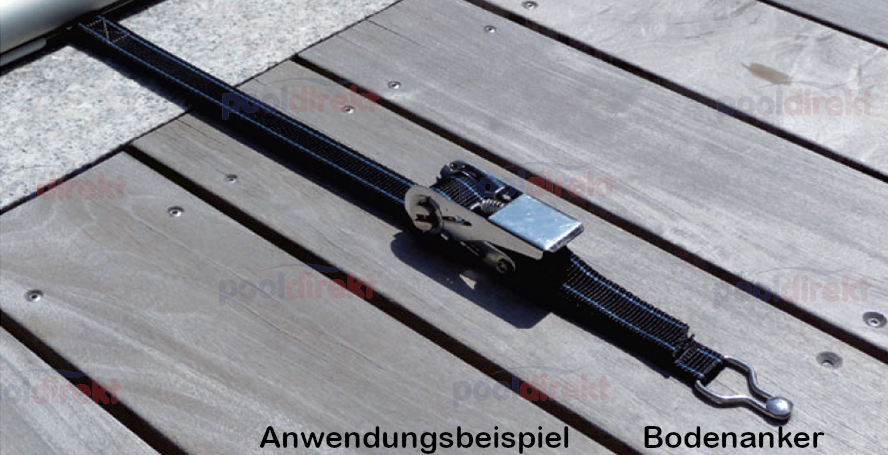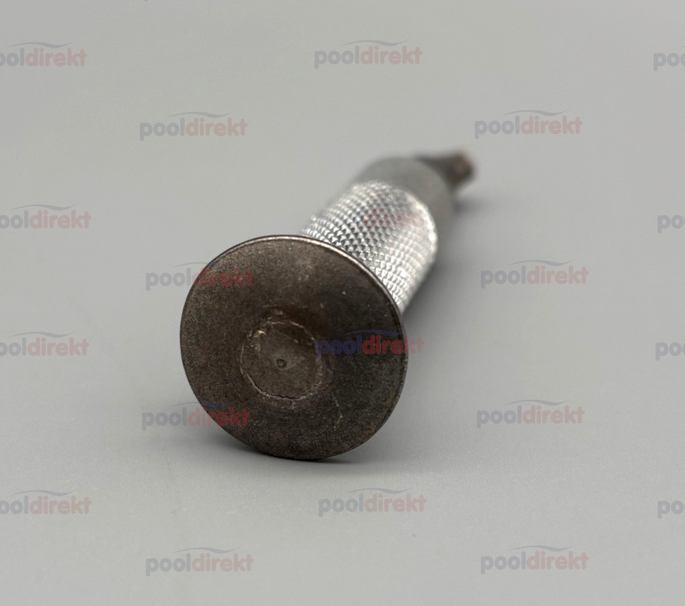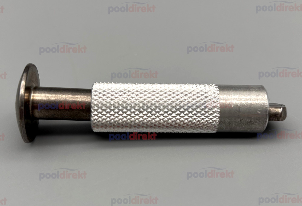 Herausziehbarer Edelstahl-Stift mit Hülse, als versenkbarer Bodenanker zur Befestigung von Poolabdeckungen an der Pool-Umrandung.
