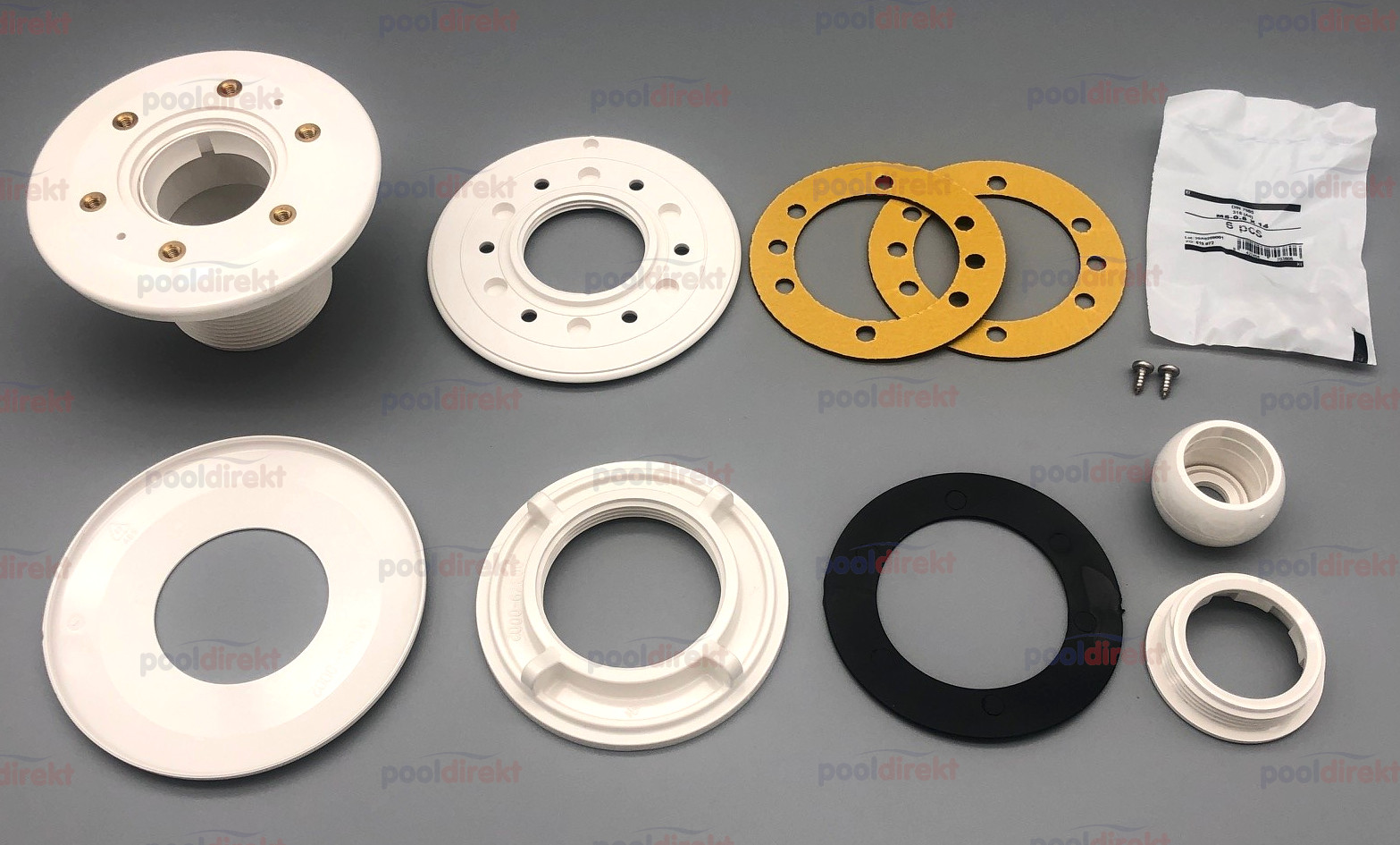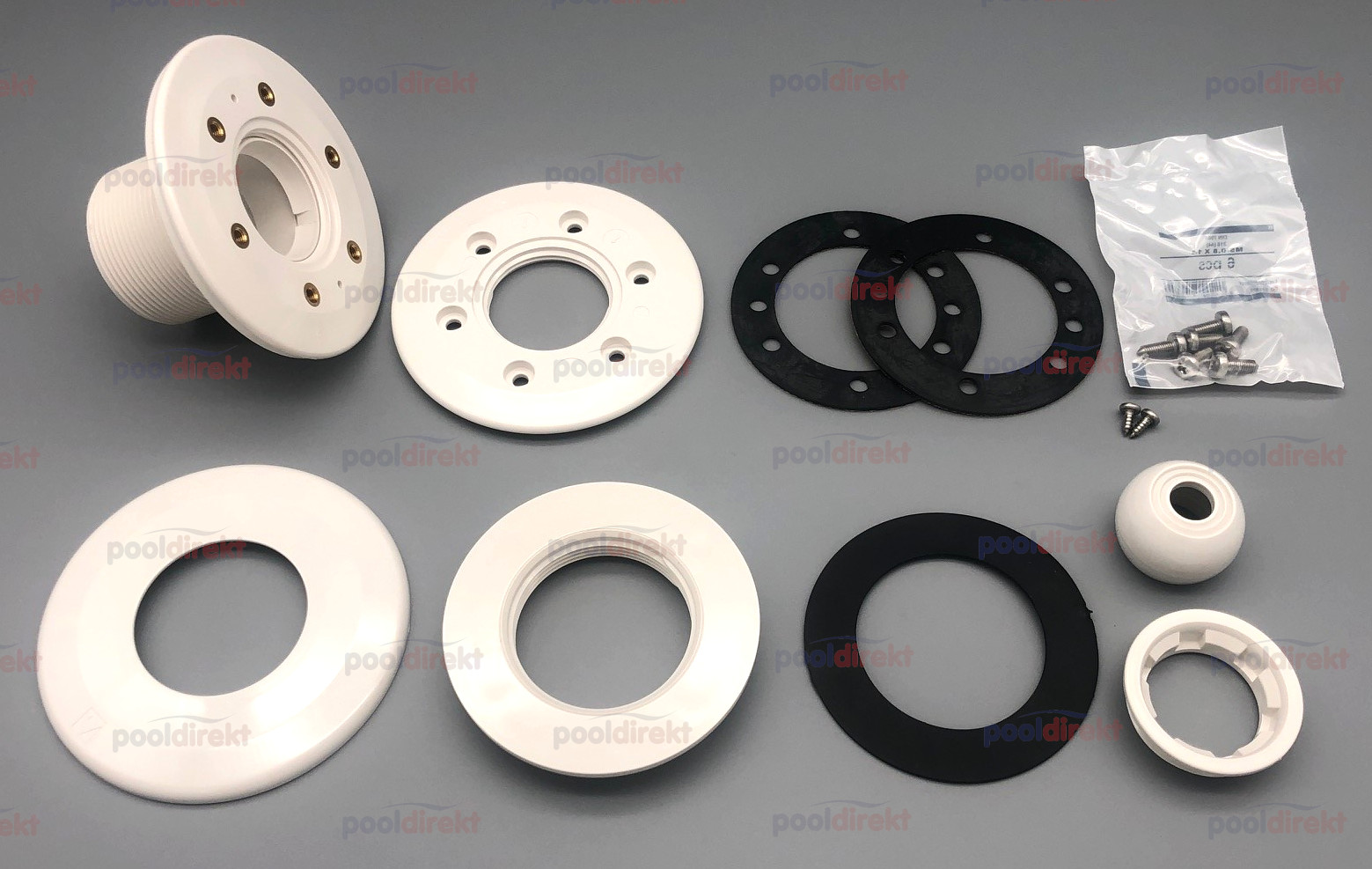 Flache Ausführung für Aufstell- und Beton-/Folienbecken. Montage möglich auch für Polyesterbecken und Framepools. Blende, Kugel und Halterung sind in den Farben weiß, anthrazit, grau und beige erhältlich.