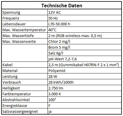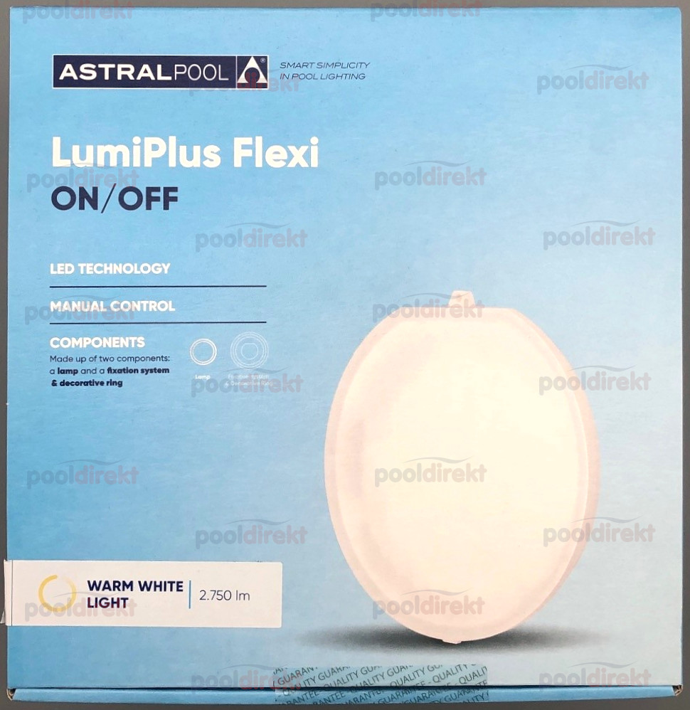 Astral LED komplett Scheinwerfer Lumiplus Flexi on/off - Lichtfarbe warmweiß - Blende weiß: LED Lichtfarbe warmweiß (3.000 K) Blende Farbe weiß 2.750 Lumen 12V, 28W 2,5m Kabel bestehend aus Nische 1043106, Kabelschutzschlauch 1042853, Blende und Leuchtmittel Version on/off - nicht dimmbar!  Vergessen Sie nicht auf den passenden Trafo und die Kabelanschlußdose - siehe Zubehör!