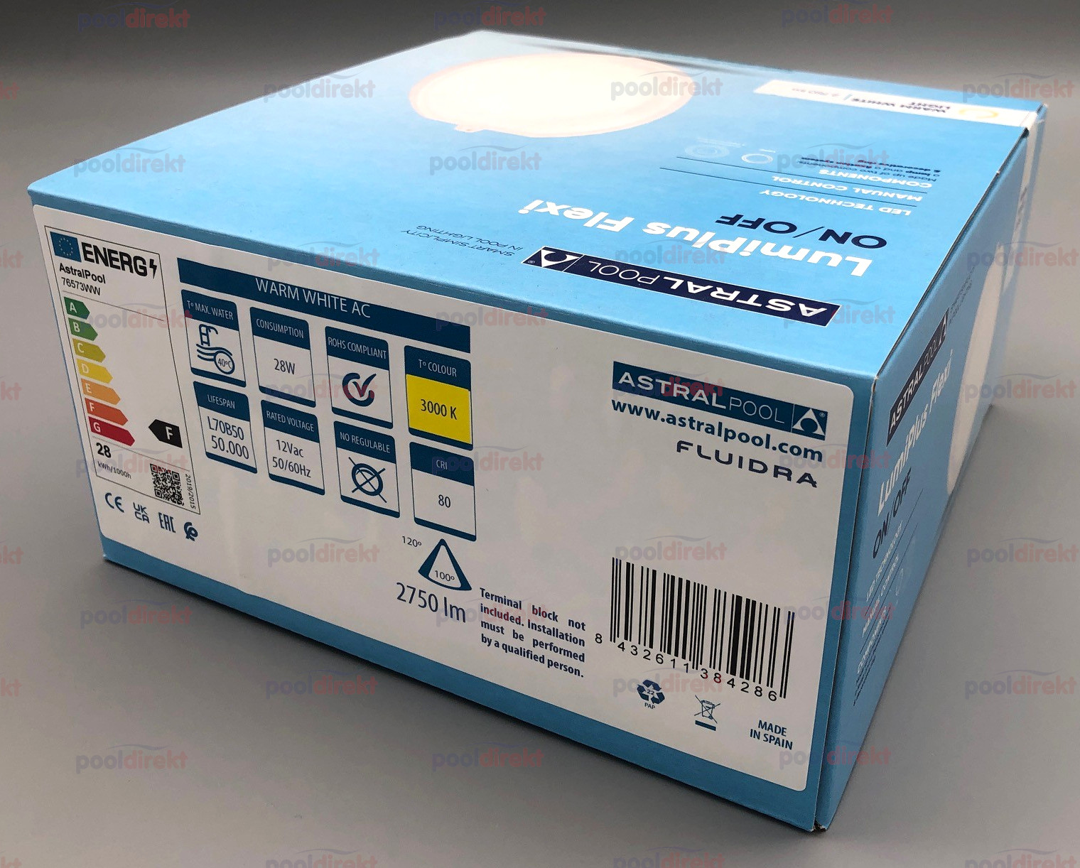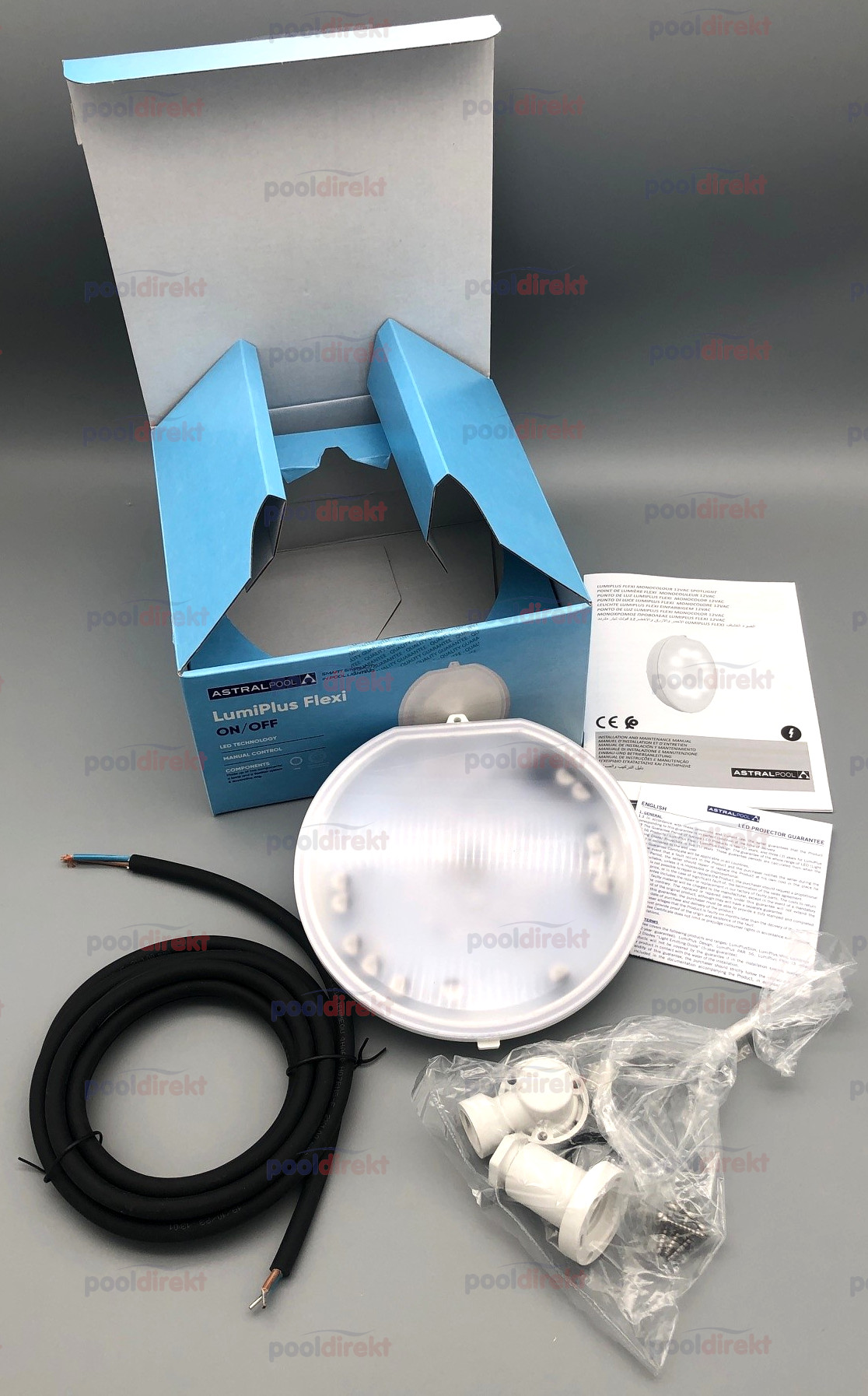 Astral LED komplett Scheinwerfer Lumiplus Flexi on/off - Lichtfarbe warmweiß - Blende hellgrau: LED Lichtfarbe warmweiß (3.000 K) Blende Farbe grau 2.750 Lumen 12V, 28W 2,5m Kabel bestehend aus Nische 1043106, Kabelschutzschlauch 1042853, Blende und Leuchtmittel Version on/off - nicht dimmbar!  Vergessen Sie nicht auf den passenden Trafo und die Kabelanschlußdose - siehe Zubehör!