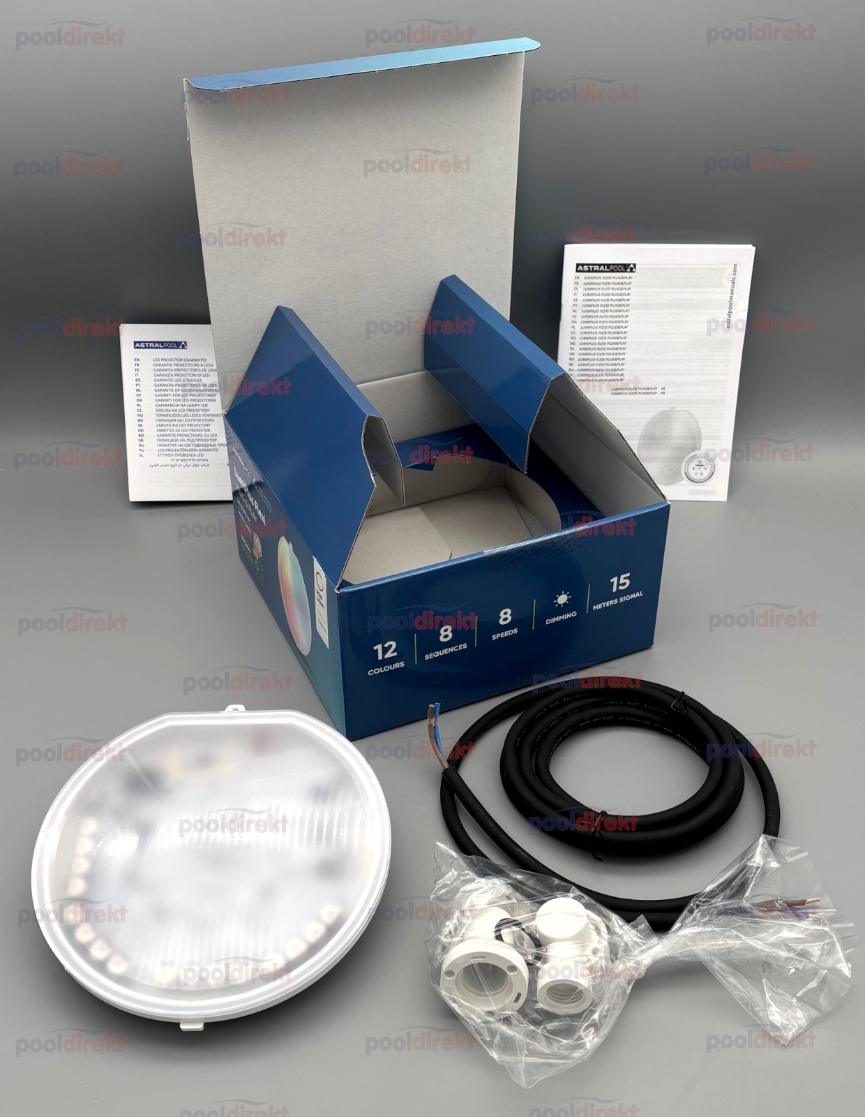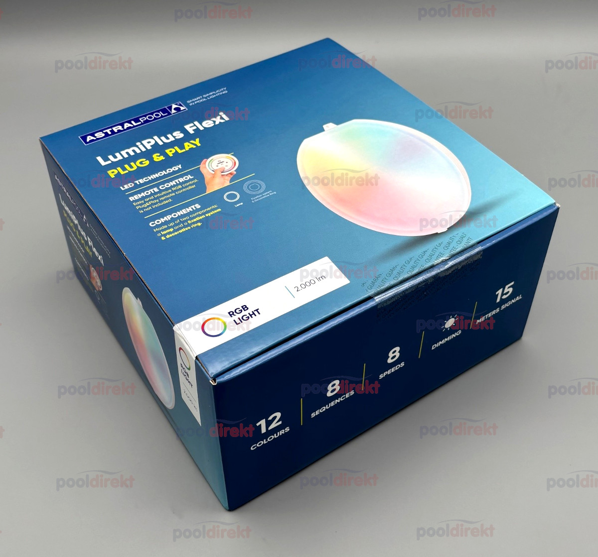Komplett-Scheinwerfer Astral LumiPlus Flexi Plug&Play RGB mit 1 Fernbedienung. LED Lichtfarbe RGB Blende Farbe weiß 2.000 Lumen 12V, 34,5W 2,5m Kabel 1 Scheinwerfer pro 20-25 m² Pooloberfläche empfohlen bestehend aus Nische 1043106, Kabelschutzschlauch 1042853, Blende und Leuchtmittel Plug&Play RGB (76579M) Mit der enthaltenen LumiPlus Plug&Play Fernbedienung können Sie Ihre Poolbeleuchtung steuern (Farbe, Helligkeit, Farbwechselprogramme). Falls Sie 2 Scheinwerfer installieren möchten, wählen Sie als zweiten Scheinwerfer die Version ohne Fernbedienung! ACHTUNG - das enthaltene Leuchtmittel lässt sich NUR mit der Plug&Play Fernbedienung steuern, nicht über das Connect-Modul, nicht mit anderen Astral Fernbedienungen! Demonstrationsvideo (YouTube):   Vergessen Sie nicht auf den passenden Trafo (Achtung - keine elektronischen Trafos verwenden, nur Eisenkerntrafos) und die Kabelanschlußdose - siehe Zubehör!