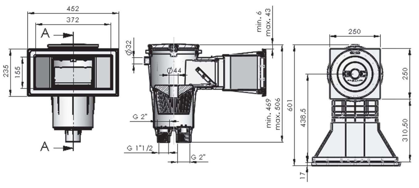 - Anschluss: 1 1/2" I.G. zum Filter, 2" I.G. vom Ablauf