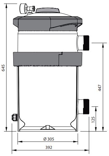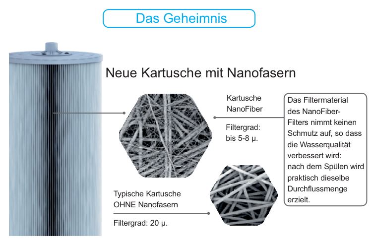 Selbstreinigender Kartuschenfilter mit einer speziellen Kartusche aus Nanofasern mit einer Filterrate von 5 bis 8 Mikrometern. Die NanoFiber-Filterreihe umfasst drei Modelle mit unterschiedlichen Durchflussraten, je nach Kartusche, für drei Bereiche: 10, 15 und 18 m³/h - entsprechend Poolgrößen bis 50 m³, 75 m³ und 90 m³ und ist dabei sehr platzsparend (Durchmesser: ca. 40 cm, Höhe: ca. 65 cm).