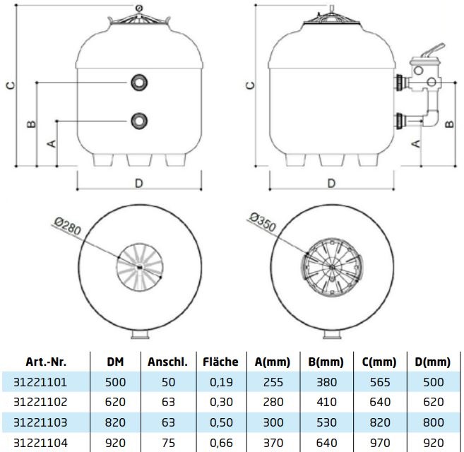 Speck Florenz Filterkessel sind glasfaserverstärkt und laminiert, mit Edelstahlschrauben sowie EPDM Dichtungen ausgestattet. Einfacherer Sandwechsel durch große Öffnung oben (280 mm)! Deckelaußendurchmesser ist 350 mm.