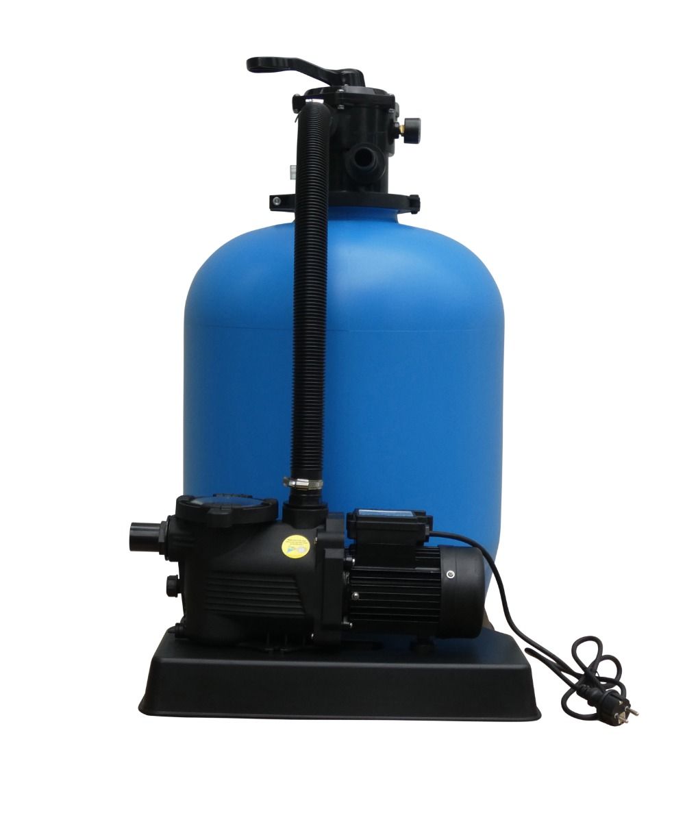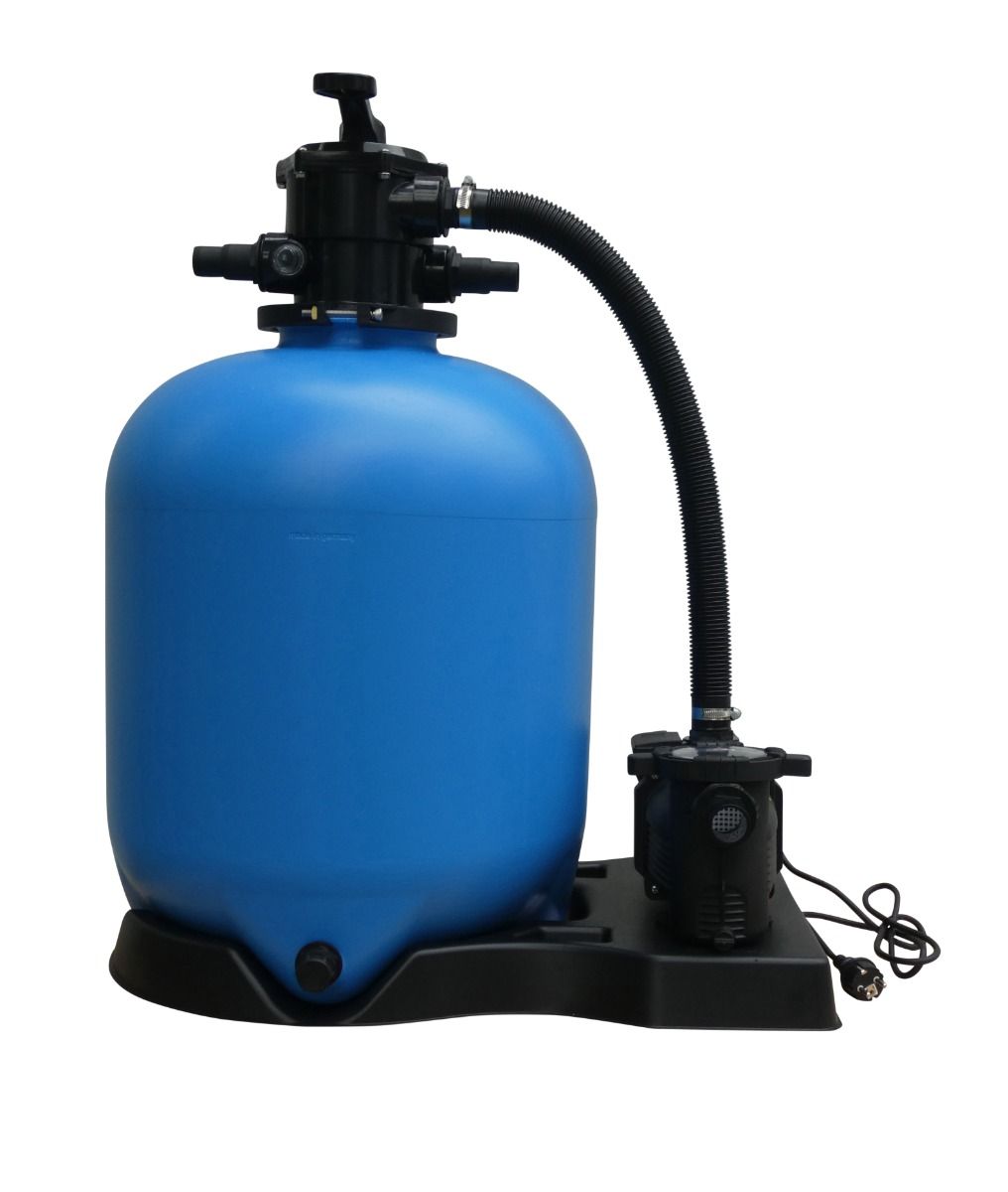 Grundplatte, Filterbehälter, Pumpe, 6-Wege-Topmount Ventil, Manometer, Schlauch zur Pumpe Ø 38 mm mit 2 Schellen 32 – 50 mm, Standrohr mit Düse bzw. Filterkreuz und Entleerung.