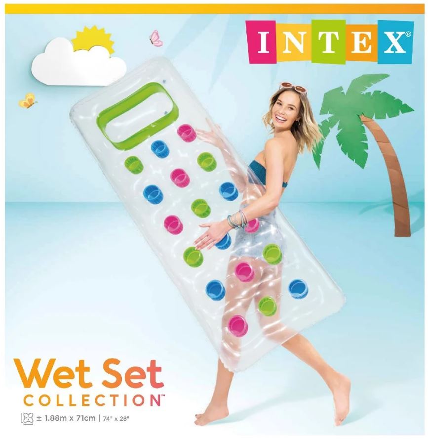 Luftmatratze transparent mit grünem Dekor im Kopfteil.