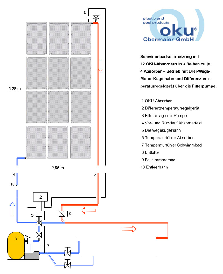 OKU® Schwimmbadsolarheizungen sind äußerst effizient, günstig in der Anschaffung und können in der Regel mit der vorhandenen Poolpumpe der Sandfilteranlage betrieben werden. Dies bedeutet, dass in solchen Fällen keine weiteren Stromkosten anfallen und mit den Solarkollektoren Ihr Pool umweltfreundlich beheizt wird.
