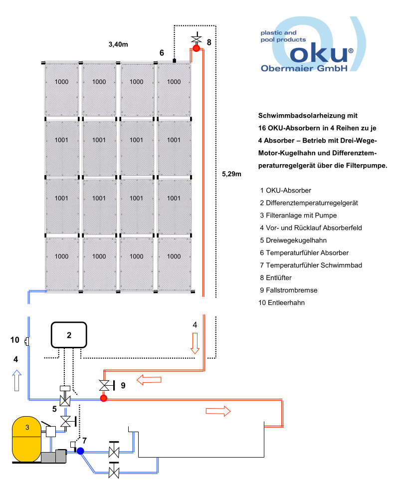 OKU® Schwimmbadsolarheizungen sind äußerst effizient, günstig in der Anschaffung und können in der Regel mit der vorhandenen Poolpumpe der Sandfilteranlage betrieben werden. Dies bedeutet, dass in solchen Fällen keine weiteren Stromkosten anfallen und mit den Solarkollektoren Ihr Pool umweltfreundlich beheizt wird.