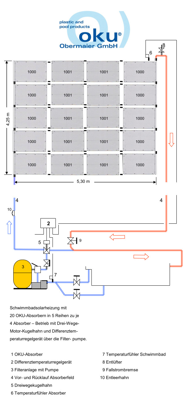 OKU® Schwimmbadsolarheizungen sind äußerst effizient, günstig in der Anschaffung und können in der Regel mit der vorhandenen Poolpumpe der Sandfilteranlage betrieben werden. Dies bedeutet, dass in solchen Fällen keine weiteren Stromkosten anfallen und mit den Solarkollektoren Ihr Pool umweltfreundlich beheizt wird.