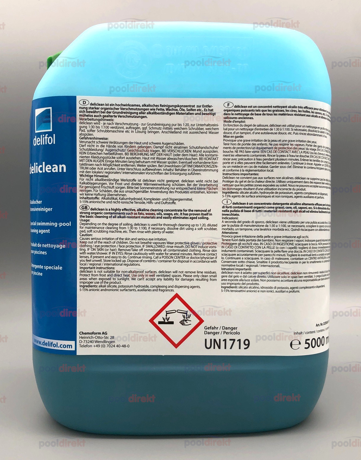 Für nicht alkalibeständige Werkstoffe ist der Reiniger nicht geeignet. deliclean wirkt nicht bei Kalkablagerungen. Einstufung »C« ätzend. Vor Frost und direkter Wärmeeinwirkung schützen. Bei der Verarbeitung für genügend Frischluft sorgen.