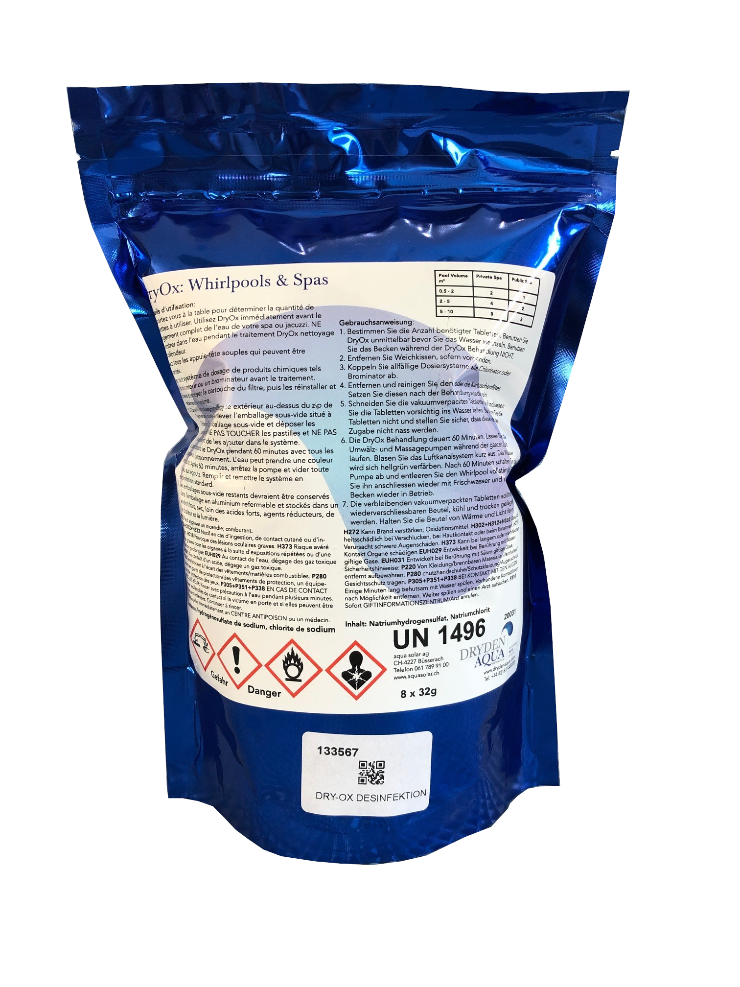 Geben Sie alle 4 Wochen pro 10 m³ Wasser 1 DryOx Tablette in den Skimmer oder in den Ausgleichsbehälter und spülen Sie die Filter nach 15-30 Minuten zurück.