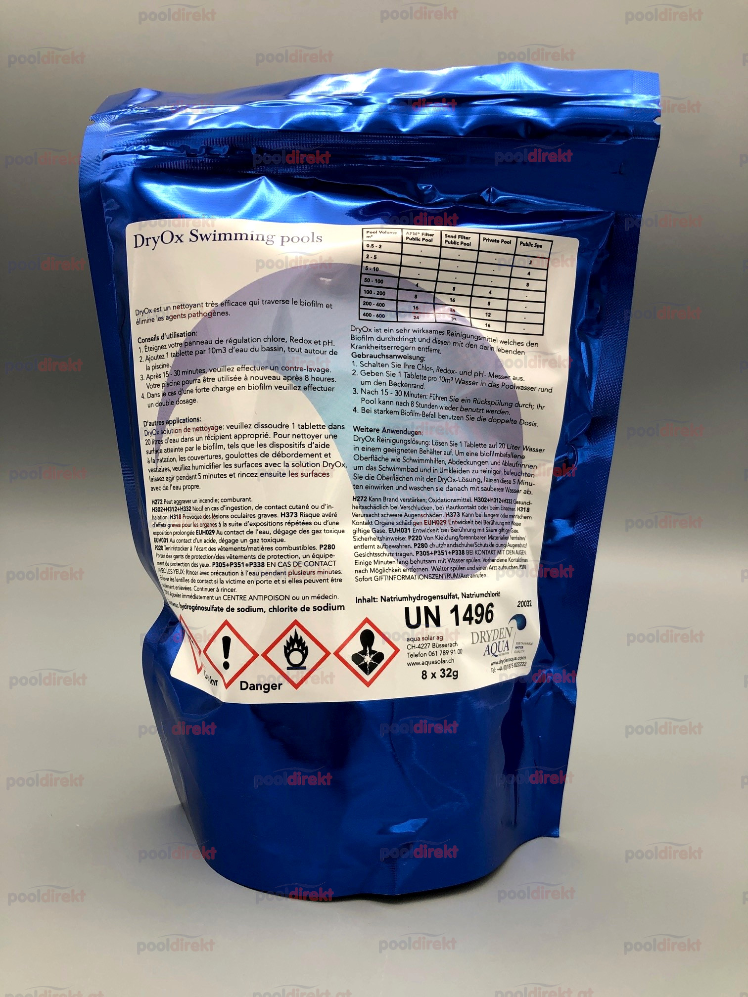 DryOx Tabletten bilden im Wasser gelöstes Chlordioxid und beseitigen so einfach und kostengünstig den Biofilm im Pool oder Whirlpool, sowie in Rohrleitungen, Ausgleichsbehältern und Sandfiltern.