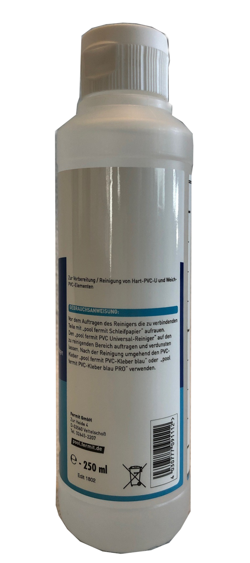 Vor dem Auftragen des Reinigers die zu verbindenden Teile mit Schleifpapier aufrauhen. Den Pool Fermit PVC Universal-Reiniger auf den zu reinigenden Bereich mit einem sauberen Lappen auf beide Fügeteile auftragen und verdunsten lassen. Nach der Reinigung umgehend den PVC Kleber verwenden.