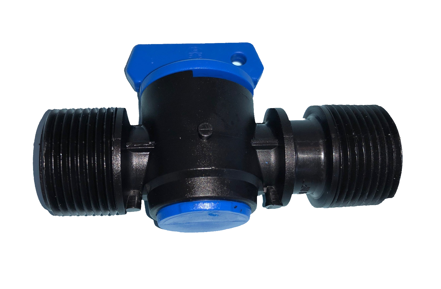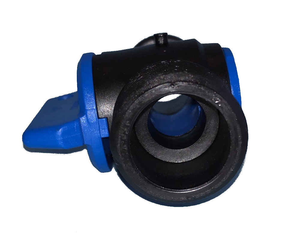 PVC Ablassventil 3/4" Außengewinde auf 3/4" Außengewinde schwarz mit blauem Hahn.