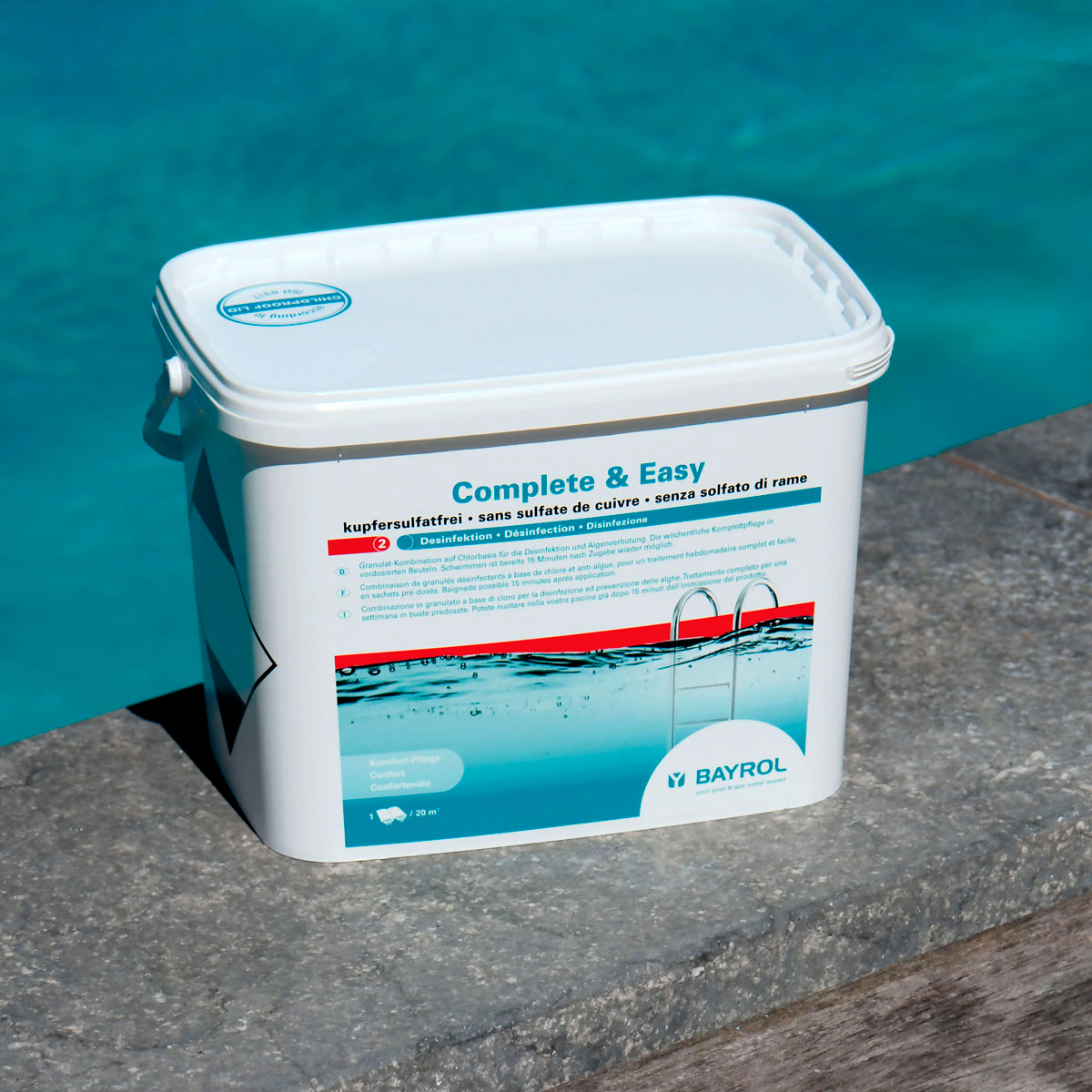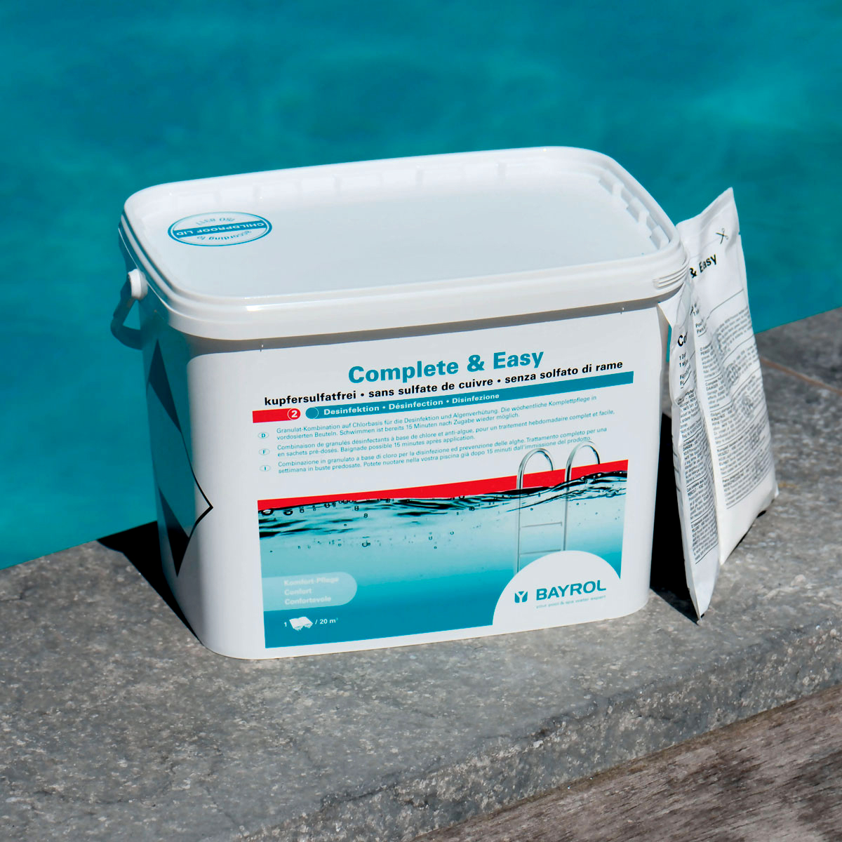 Wirkweise. Der große Vorteil dieser Kombination ist, dass Sie Ihren Pool bereits 15 Minuten nach Anwendung wieder benutzen können. Durch den bereits vorportionierten Doppelbeutel ist die Dosierung von Complete & Easy denkbar einfach. Complete & Easy enthält kein Kupfersulfat. Für alle Filtertypen geeignet, ab 20 m³ Poolgröße.