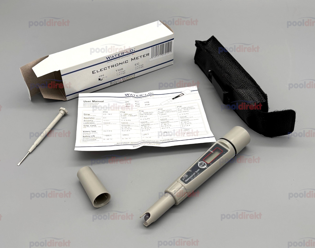 Der wasserdichte FT11 ist ein elektronischer pH-Wert Tester, der die professionelle Messung des pH-Werts im Pool, Whirlpool, Teich, Brunnen oder Aquarium ermöglicht – ganz ohne zusätzliche Reagenzien (Tabletten, Tropfen etc.).