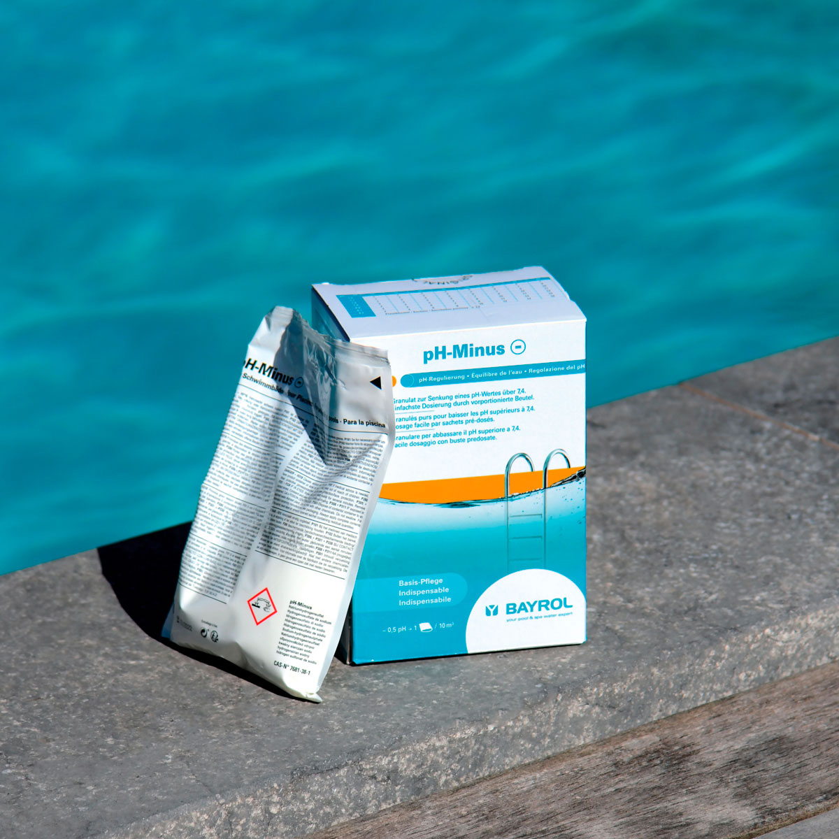 pH-Minus Granulat zur manuellen pH-Wert Senkung des Schwimmbadwassers im Pool, Swim Spa oder Whirlpool aus dem alkalischen in den Idealbereich 7,0 - 7,4. Als Feststoff - Säurepräparat lange lagerfähig Absolut Chlorid frei, schnell und rückstandsfrei löslich Anwendung: Die Zugabe erfolgt zur besseren Durchmischung bei laufender Filteranlage nach dem Badebetrieb pH-Minus in einem Eimer mit Wasser auflösen und entlang des Beckenrandes langsam in Wasser gießen Nicht in der Nähe von Metallteilen zugeben. Circa Zugabe Mengen je 100 m³ Schwimmbeckenwasser:(Diese Angaben beziehen sich ausschließlich auf Pool & Care Wasserpflegeprodukte) 1,5 kg pH-Minus Granulat reichen aus um den pH-Wert von 100 m³ Schwammbadwasser um ca. 0,2 zu senken Hartes Wasser benötigt mehr, weiches Wasser weniger pH-Regulator Den pH-Wert mindestens 1-mal pro Woche prüfen Enthält: Natriumhydrogensulfat Inhalt: 1,5 kg   WARNUNG:Niemals mit anderen Chemikalien mischen!Niemals mit Wasser verdünnen!Produkt außerhalb der Reichweite von Kindern, stehend und verschlossen im Originalgebinde, kühl und sonnengeschützt transportieren und lagern.Gefahren- und Sicherheitshinweise sind in der Rubrik Download ersichtlich. Produkt sicher verwenden. Vor Gebrauch stets Kennzeichnung und Produktinformationen lesen. Gefahrenhinweise:H318 Verursacht schwere Augenschäden.Sicherheitshinweise:P101 Ist ärztlicher Rat erforderlich, Verpackung oder Kennzeichnungsetikett bereithalten.P102 Darf nicht in die Hände von Kindern gelangen.P280 Schutzhandschuhe/Schutzkleidung/Augenschutz/Gesichtsschutz tragen.P305+P351+P338 BEI KONTAKT MIT DEN AUGEN: Einige Minuten lang behutsam mit Wasser spülen. Eventuell vorhandene Kontaktlinsen nach Möglichkeit entfernen. Weiter spülen.P310 Sofort GIFTINFORMATIONSZENTRUM/Arzt anrufen. Signalwort: Gefahr! Nach EG-Richtlinien GefStoffV. Biozide sicher verwenden. Vor Gebrauch stets Kennzeichnung und Produktinformationen lesen.