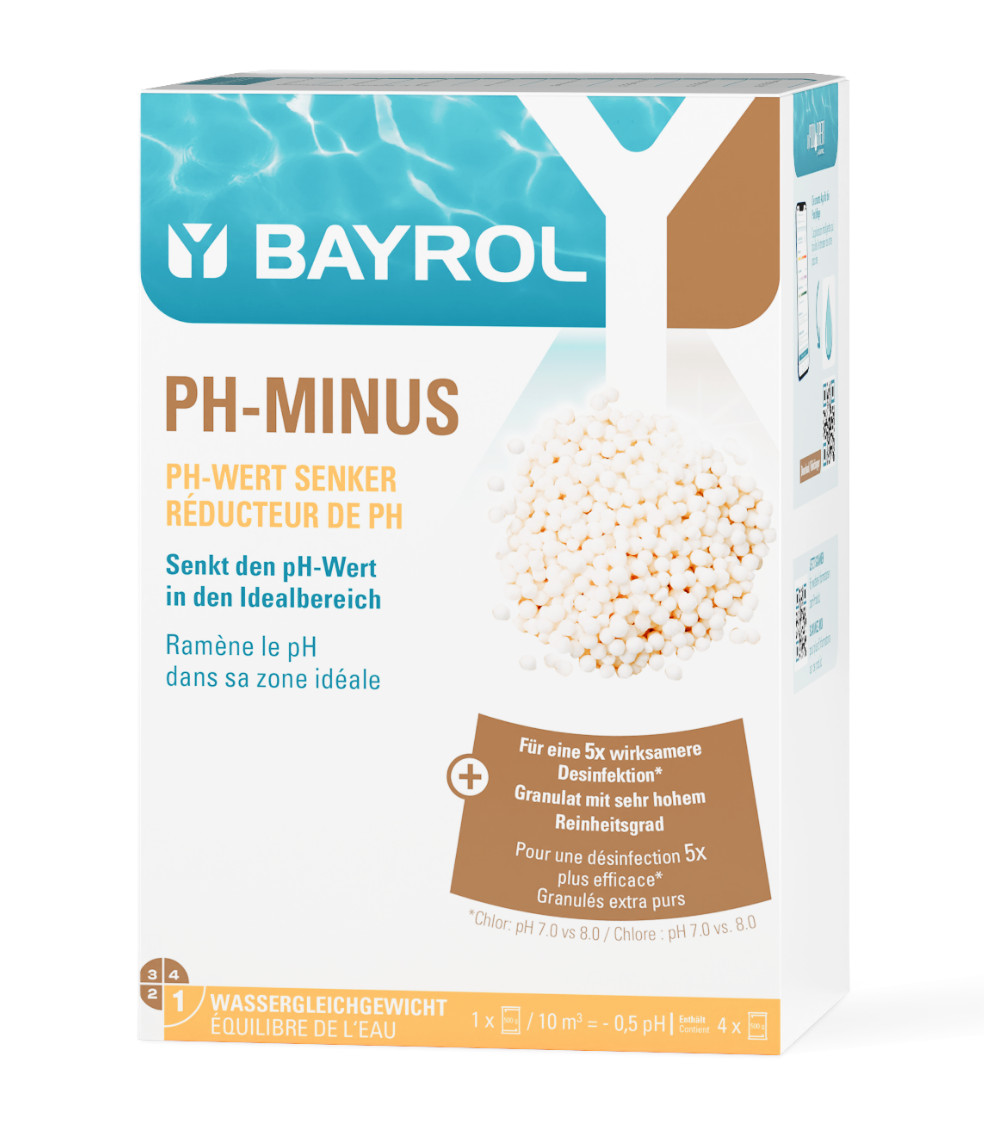 • Um den pH-Wert um 0,5 zu senken, ist ein Beutel pH-Minus (500 g) pro 10 m³ erforderlich.