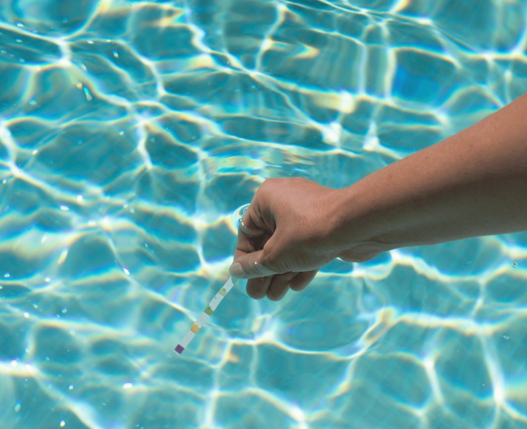• Stellen Sie den Teststreifen in die Wasserprobe (in 2,5 cm Wasser tauchen).