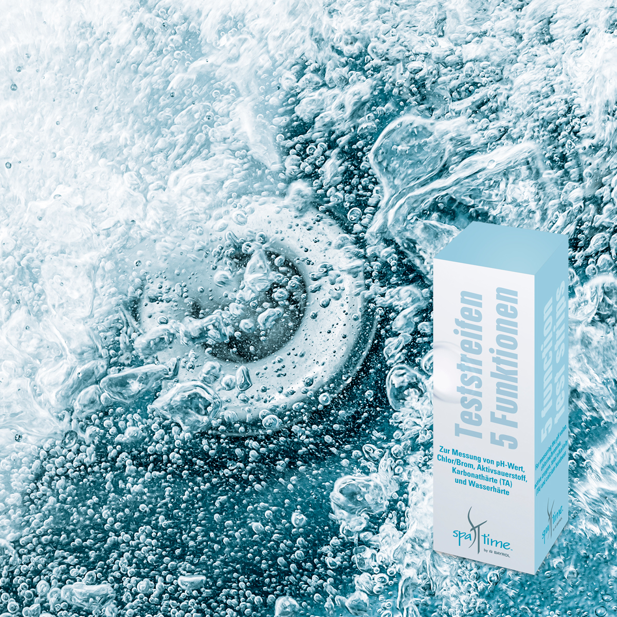 Dose mit 50x Whirlpool Teststreifen für die Wasseranalyse. Die SpaTime Teststreifen messen schnell und einfach 5 wichtige Wasserparameter: pH-Wert, Chlor/Brom, Aktivsauerstoff, Alkalinität (TA) und Gesamthärte.
