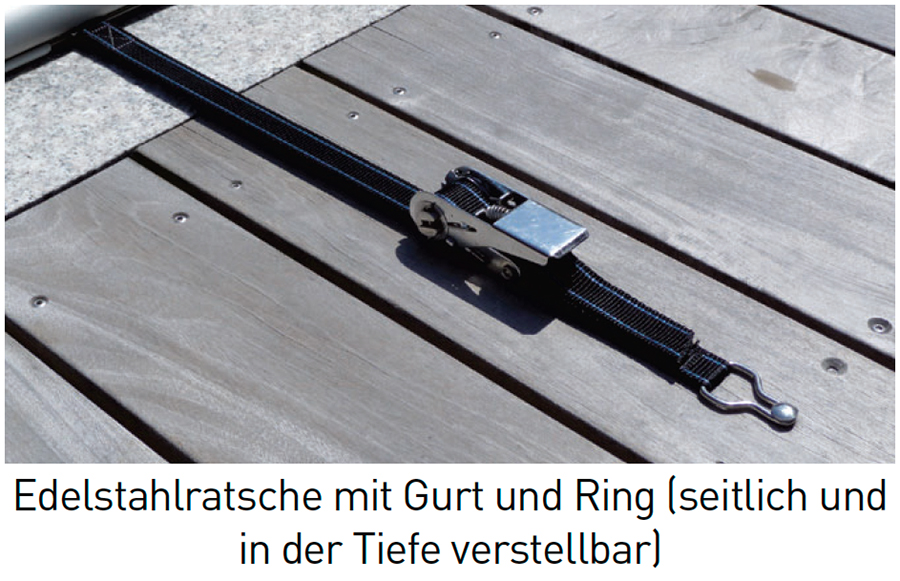 - Sicherheit: Gurte und Edelstahl-Ratschen an den Breitseiten (einfach und schnell)