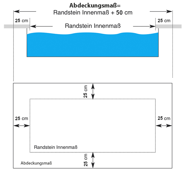 Die Abdeckung muss an allen Seiten ein Übermaß von 25 cm vom inneren Randstein haben: