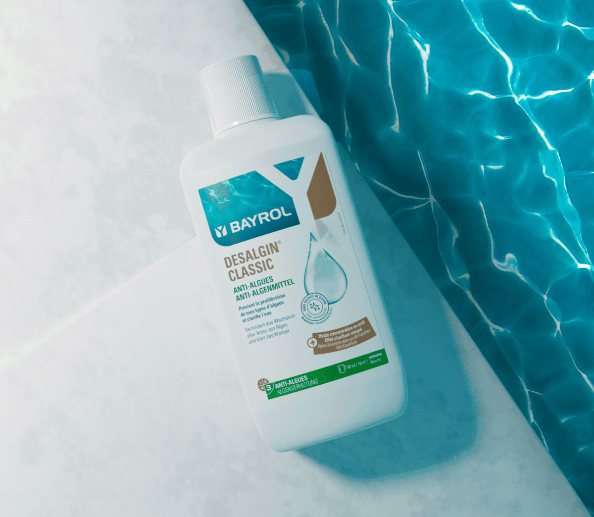 Geben Sie 50 ml Desalgin® CLASSIC pro 10 m³ zu. Bei stärkerem Badebetrieb, Gewitterregen und höheren Temperaturen sind erhöhte Zugaben bis zur doppelten Menge erforderlich.