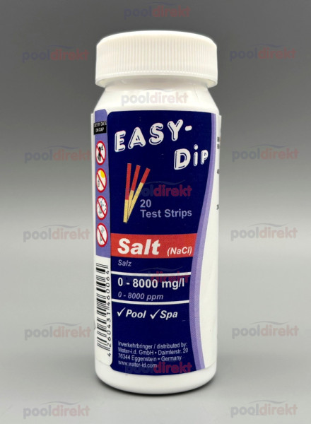 Teststreifen für die schnelle und einfache Bestimmung des Salzgehaltes im Poolwasser bei Anwendung von Salzelektrolyse-Verfahren.
