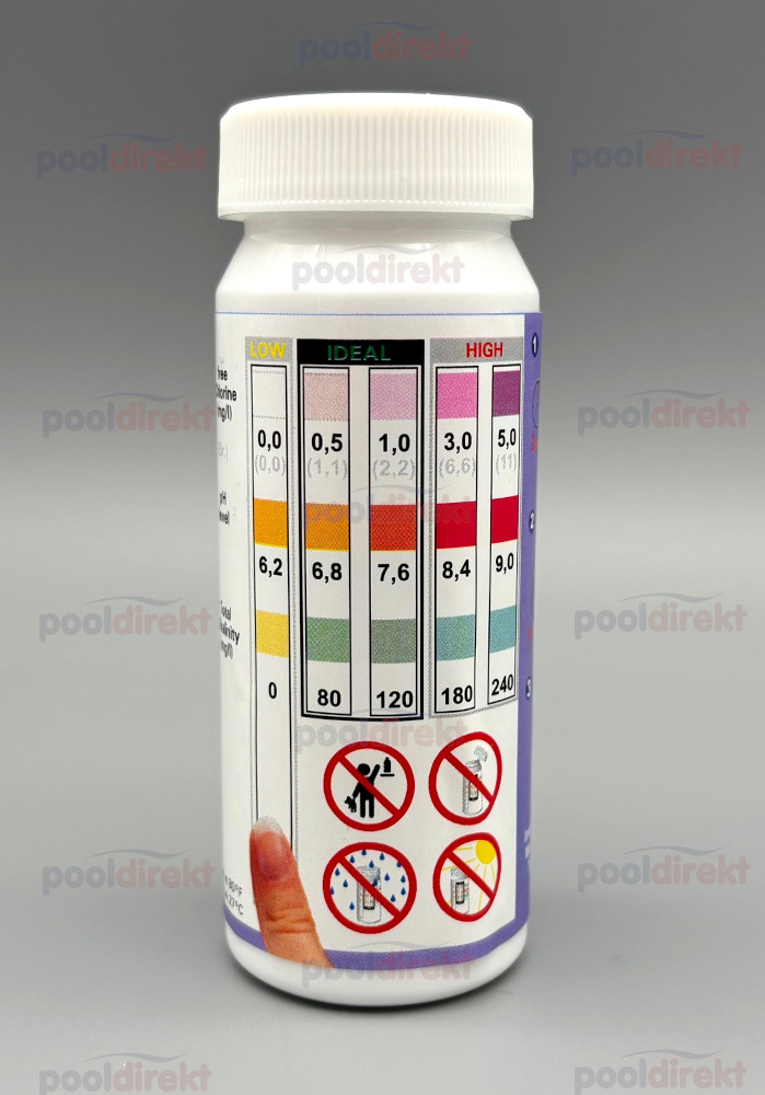 - Schütteln Sie bitte nicht das Poolwasser von dem Teststreifen ab, horizontal aus dem Wasser nehmen.