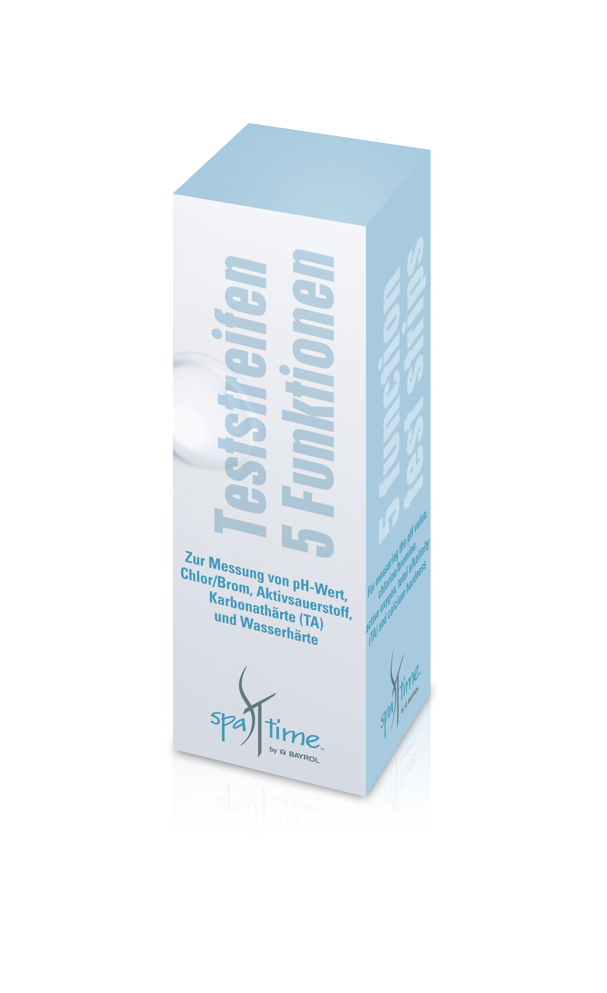 Dose mit 50x Whirlpool Teststreifen für die Wasseranalyse. Die SpaTime Teststreifen messen schnell und einfach 5 wichtige Wasserparameter: pH-Wert, Chlor/Brom, Aktivsauerstoff, Alkalinität (TA) und Gesamthärte.
