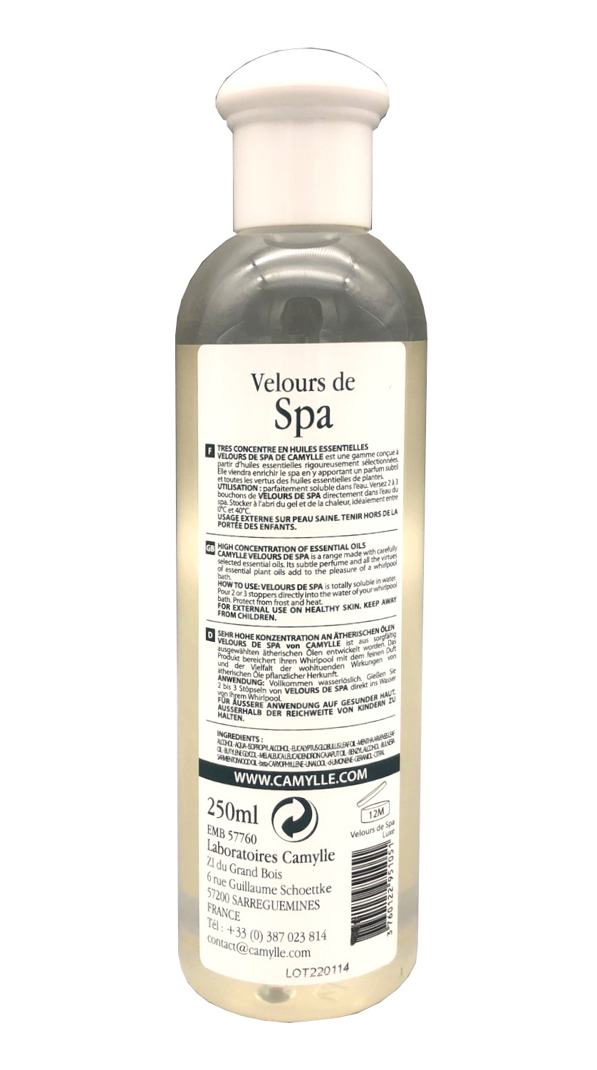 In der Tat würde ein ungeeignetes Produkt sofort das Wasser trüben, die Filter verstopfen und schaumbildende Reaktionen hervorrufen usw. Die essenziellen Öle werden in einer kosmetologischen Alkohollösung, die von den Labors von Camylle speziell entwickelt wurde, gelöst, wodurch das Produkt zu 100 % verflüchtigt wird. Es werden keinerlei Spuren im Bad hinterlassen, die Filterpatronen verstopfen nicht und das Desinfektionssystem verschmutzt nicht.
