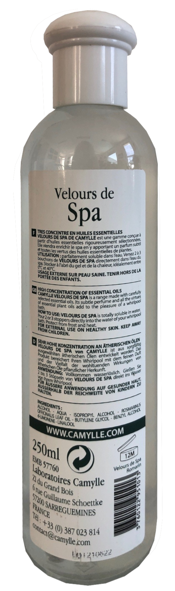 In der Tat würde ein ungeeignetes Produkt sofort das Wasser trüben, die Filter verstopfen und schaumbildende Reaktionen hervorrufen usw. Die essenziellen Öle werden in einer kosmetologischen Alkohollösung, die von den Labors von Camylle speziell entwickelt wurde, gelöst, wodurch das Produkt zu 100 % verflüchtigt wird. Es werden keinerlei Spuren im Bad hinterlassen, die Filterpatronen verstopfen nicht und das Desinfektionssystem verschmutzt nicht.